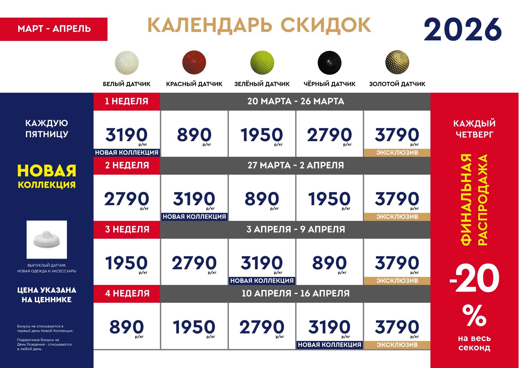 Бонусы по картам лояльности не списываются на товары секонд хенд в первый день Новой Коллекции и в день распродажи -20%!